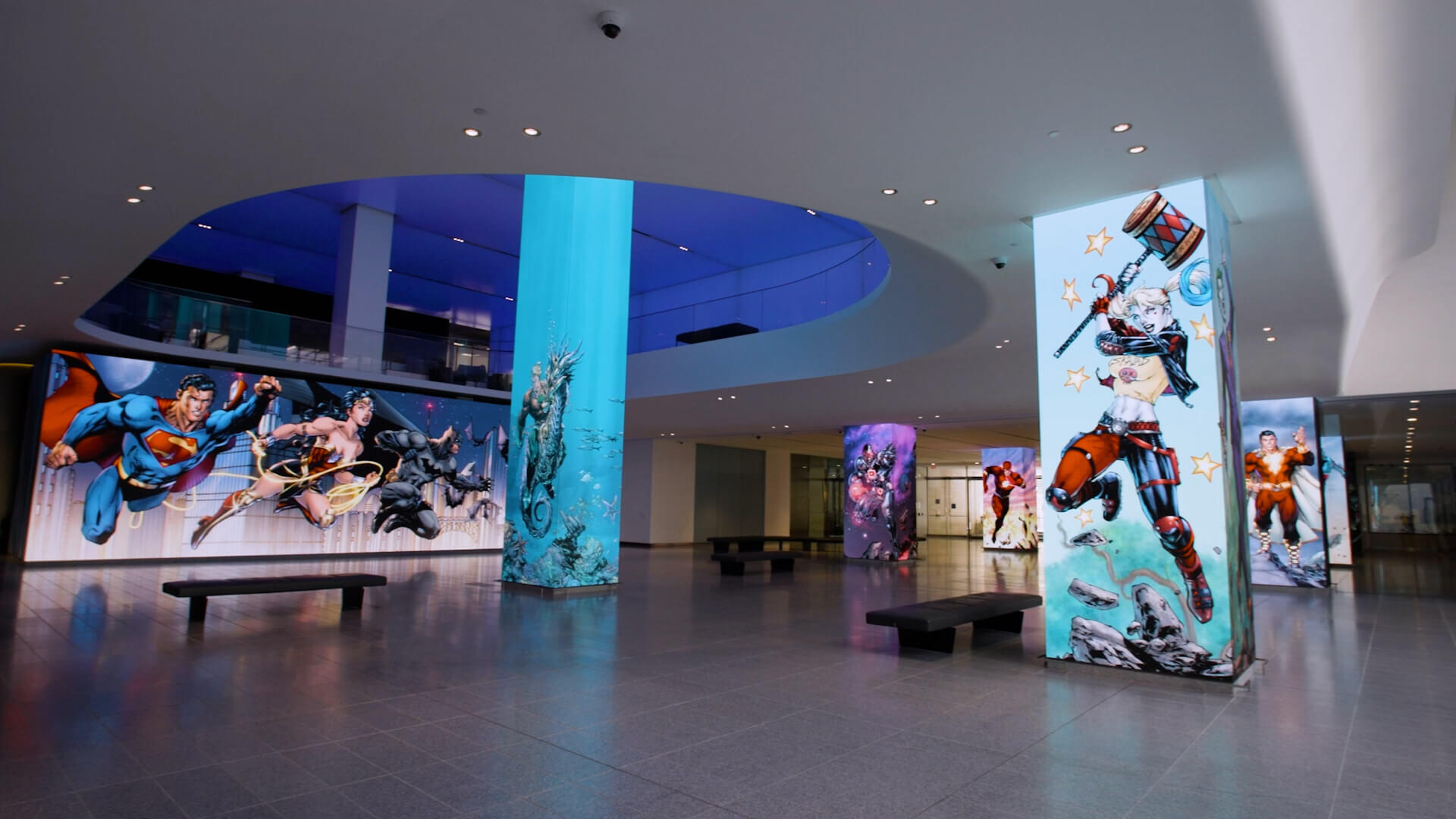 The AT&T Discovery District Lobby consists of eight evenly distributed digital columns (one of which is split by the lobby’s second level), a large, three-sided digital video wall known as the “Media Box,” and an expansive ceiling “veil.”
